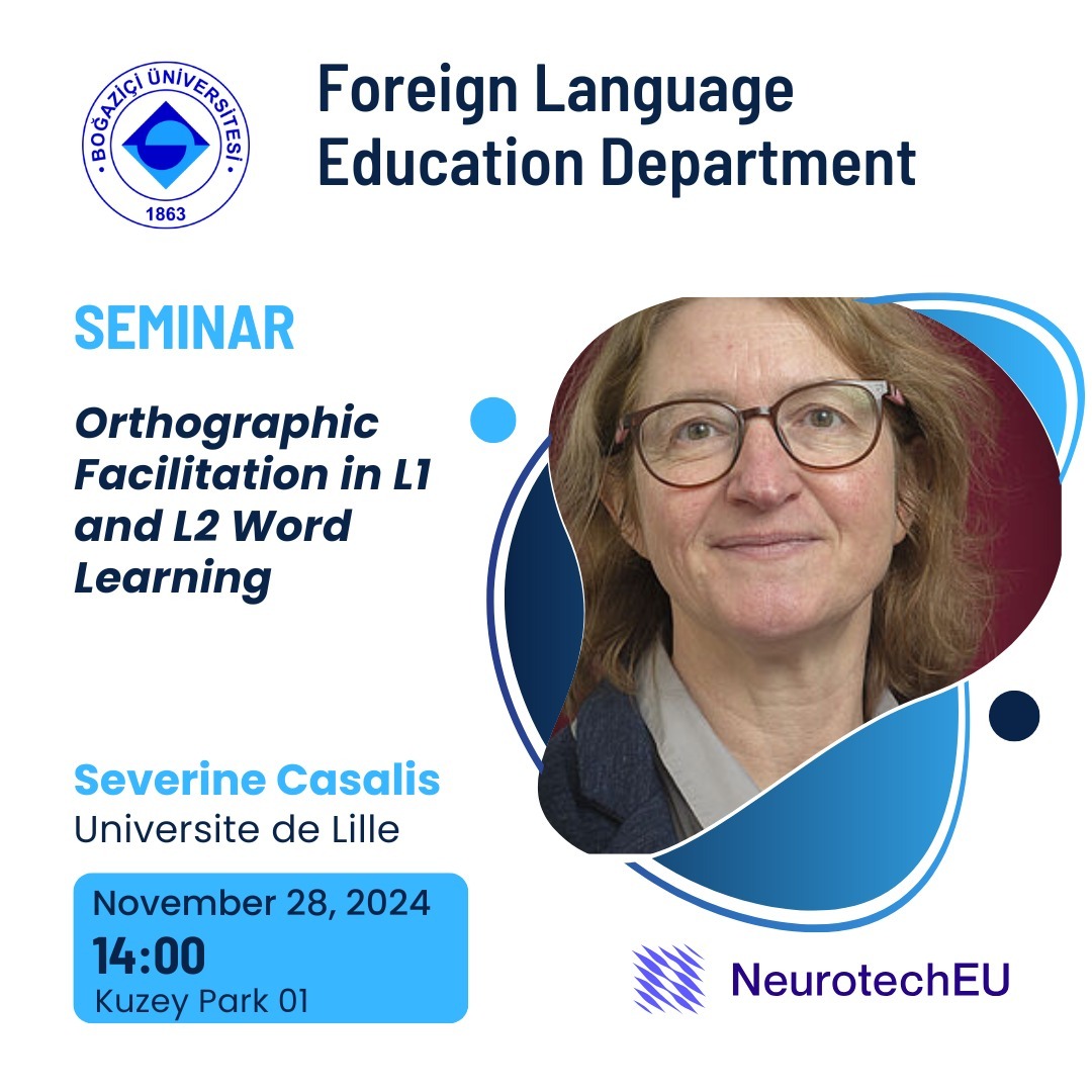 Lille Üniversitesi (Fransa) Psikoloji Bölümü öğretim üyesi Dr. Severine Casalis 28-29 Kasım 2024 tarihlerinde Boğaziçi Üniversitesi Eğitim Fakültesi Yabancı Diller Eğitimi Bölümü'nü ziyaret etti. Dr. Casalis 28 Kasım tarihinde "Anadilinde ve İkinci Dilde Ortografik Kolaylaştırma" başlıklı bir seminer verdi. 29 Kasım tarihinde ise, Nöroteknolojik Çözümler Platformu kapsamında yer alan "Okul Çağı Çocuklarında Okuma ve Matematik Temelli Öğrenme Güçlüklerinin Değerlendirilmesinde Nöroteknolojik Ölçümler ve Bilgisayar Destekli Türkçe Dilsel-Bilişsel Ölçüm Araçlarının Geliştirilmesi" başlıklı P13 numaralı projenin araştırmacıları ile bir araya gelerek NeurotechEU kapsamında ortak araştırma ve işbirliği olasılıkları hakkında fikir alışverişinde bulundu.