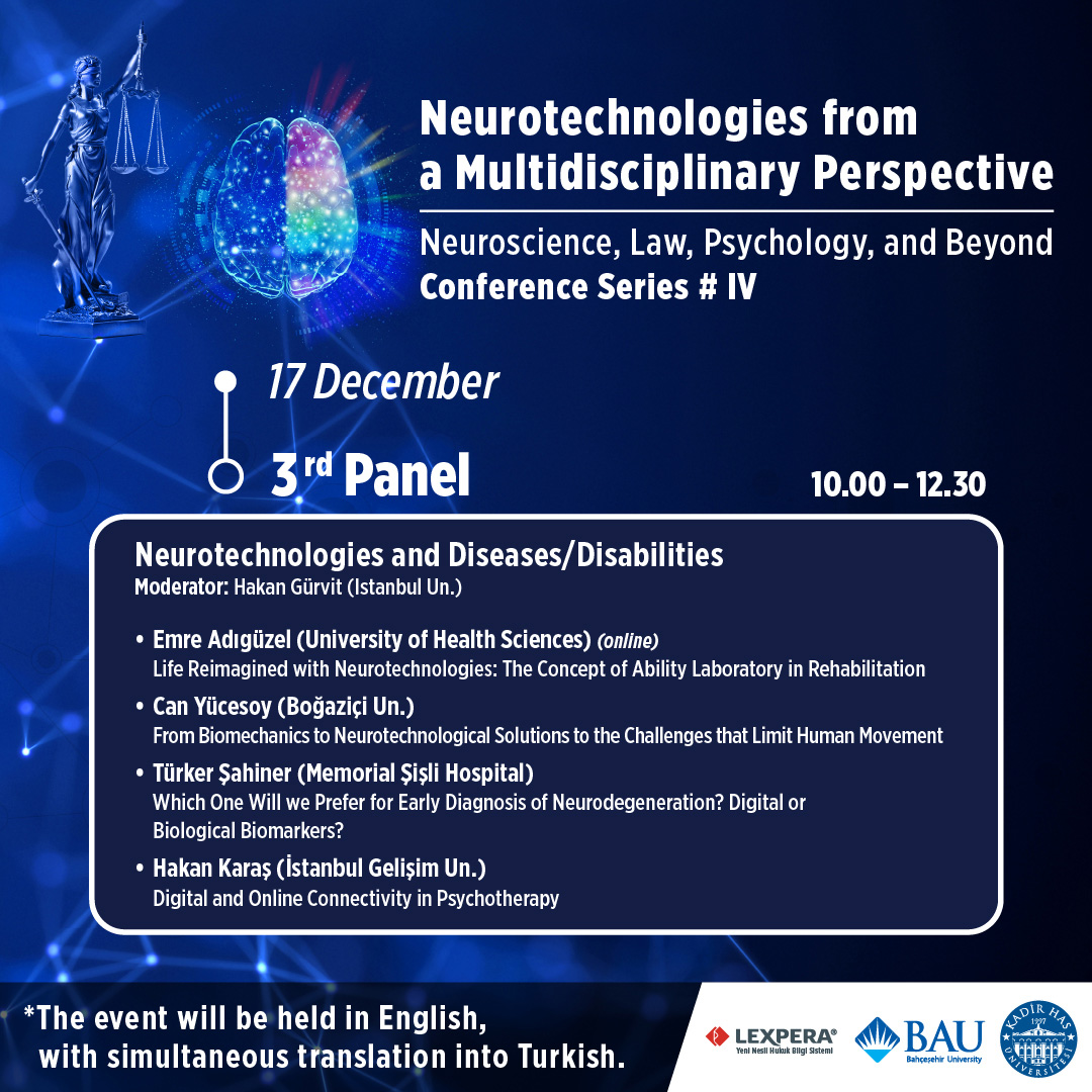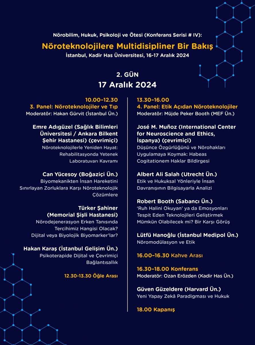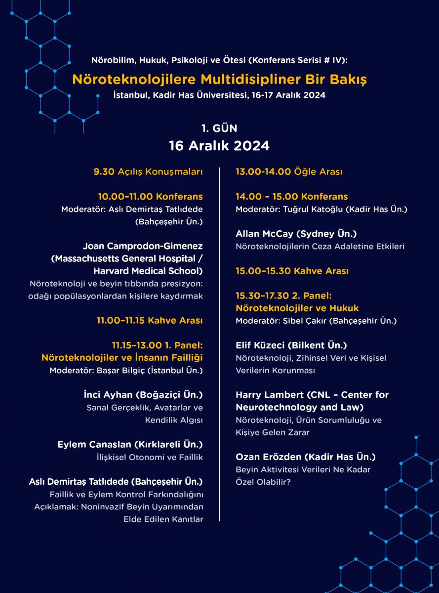 16-17 Aralık 2024 tarihlerinde Kadir Has Üniversitesi'nde gerçekleştirilen "Nöroteknolojilere Multidisipliner Bir Bakış" konferansında nöroteknolojilerin olumlu ve olumsuz yönlerine dair bir tartışma zemini oluşturarak multidisipliner bir diyaloğa alan açılması hedeflenmiştir. Konferansın farklı panel ve ana konuşmalarında Nöroteknolojiler ve İnsanın Failliği, Nöroteknolojiler ve Hukuk, Nöroteknolojiler ve Tıp, Nöroteknolojiler ve Etik konuları ele alınmıştır.