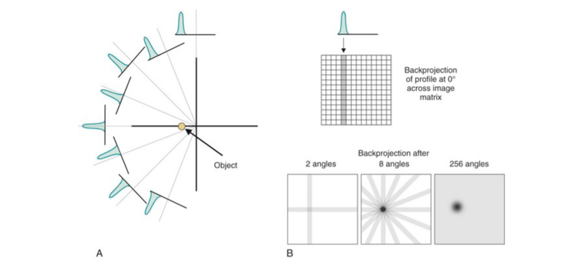 Şekil 6 – FBP görüntü rekonstrüksiyonu A) Farklı açılar için nokta kaynak için projeksiyon profilleri. B) Görüntü oluşumu.