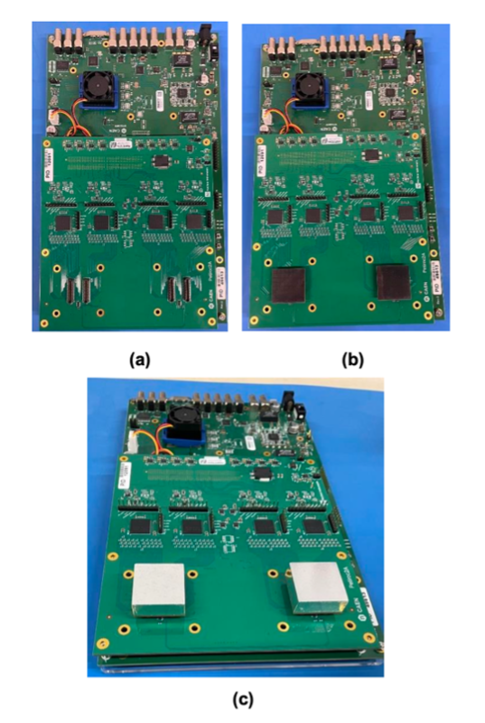 Şekil 10 – DT5550W ve A55PET4 kartlarının entegre hali (a), DT5550W, A55PET4 kartları ile SiPMlerin entegre hali (b), DT5550W, A55PET4 kartları, SiPMler ve sintilatörlerin entegre hali (c).