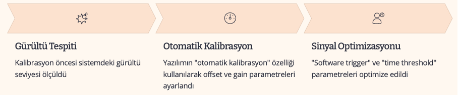 SiPM'lerden sağlıklı veri alabilmek için öncelikle sistemde gürültü tespiti ve kalibrasyonu yapılmıştır. SiPM'lerin ışıktan etkilenmemeleri için ışık almayacak kapalı bir düzenek hazırlanmıştır.