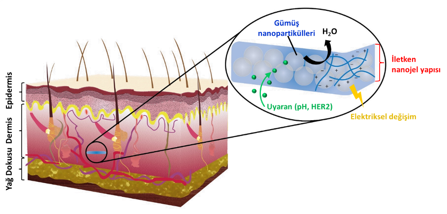 Figür 2. İmplant edilebilir nano-jel yapısı ve deri altı ara yüzü gösterimi. Önerilen malzeme yapısı çevredeki fiziksel ve kimyasal değişiklikleri algılayarak elektriksel veya fiziksel değişime uğramaktadır.