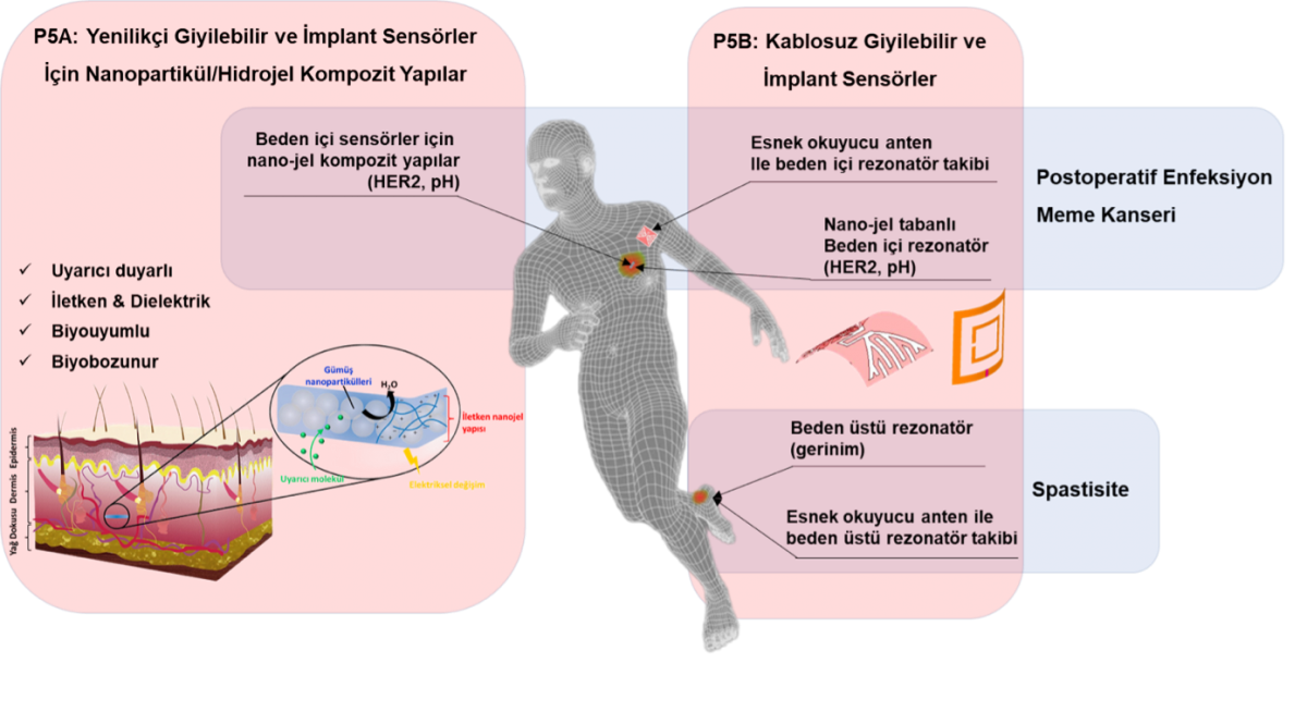 TÜBİTAK 1004 – Mükemmeliyet Merkezi Destek Programı kapsamında desteklenen prestijli projelerden biri olan Nöroteknolojik Çözümler Platformu (NTÇP) kapsamında yürütülen P5 projesi implant edilebilir veya giyilebilir sensörlerde rezonatör olarak kullanılmak üzere, biyofiziksel (pH) parametrelere duyarlı, farklı elektriksel özelliklerde hidrojel/nanopartikül (nano-jel) kompozit malzemeler geliştirilmesini amaçlamaktadır. Geliştirilmekte olan bu yenilikçi malzeme yapılarının temelini, cilde benzer biyomimetik özellikler gösterebilen biyouyumlu hidrojeller oluşturmaktadır. Hidrojel yapıları dış uyaranlara reaktif hale getirilerek farklı uygulamalarda medikal diagnostik araçları olarak kullanılabilecektir. Bu kapsamda örnek zorluk olarak postoperatif enfeksiyon takibi ele alınmaktadır. Geliştirilecek bu yenilikçi malzeme yapılarının beden içerisinde rezonatör olarak kullanıldığı durumlar için spesifik uyaranlara duyarlı olması sağlanacak olup, bu sayede farklı biyobelirteçlerin takibinin beden içerisinde gerçekleştirilebilmesi amaçlanmaktadır. P6 “Kablosuz giyilebilir ve implant sensörler ve sensörlerin kablosuz haberleşmesi” projesi ile ortaklaşa yürüyecek olan bu proje kapsamında, P6’da geliştirilecek olan beden üstüne yerleştirilebilecek beden üstü okuyucu anten ve beden içi pH duyarlı rezonatörün takibi ile erken evrede postoperatif enfeksiyon teşhisi gerçekleştirilecektir.